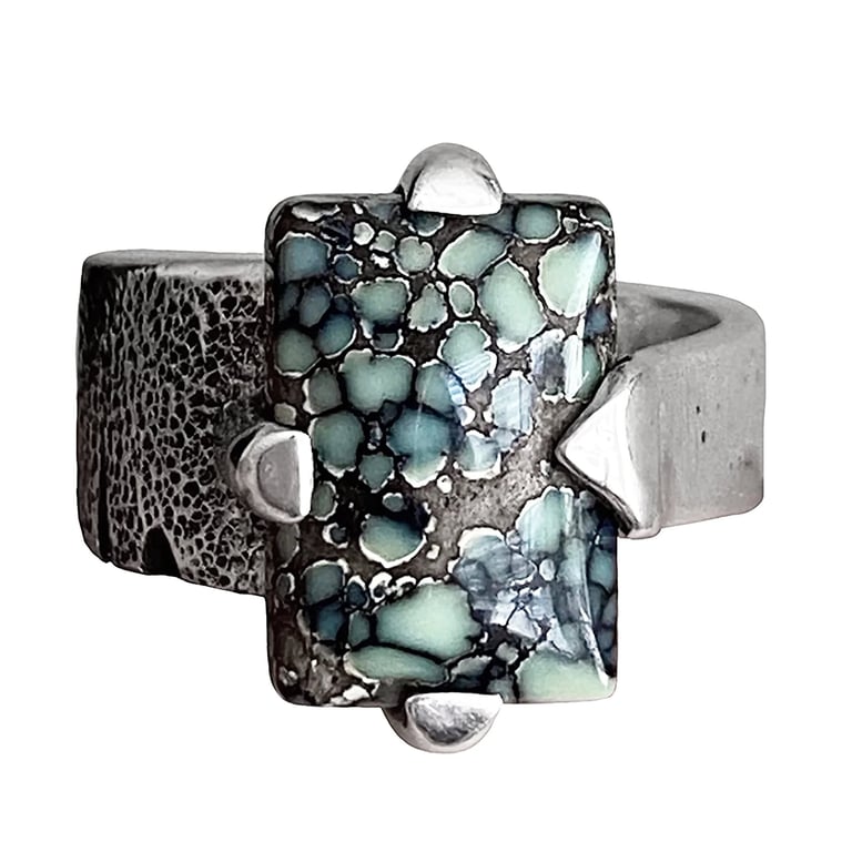 For some pieces, the journey extends to the lapidary arts, where I meticulously cut and shape gemstones, which adds a layer of complexity and uniqueness to my work. These particular gems are called Poseidon Variscite.
